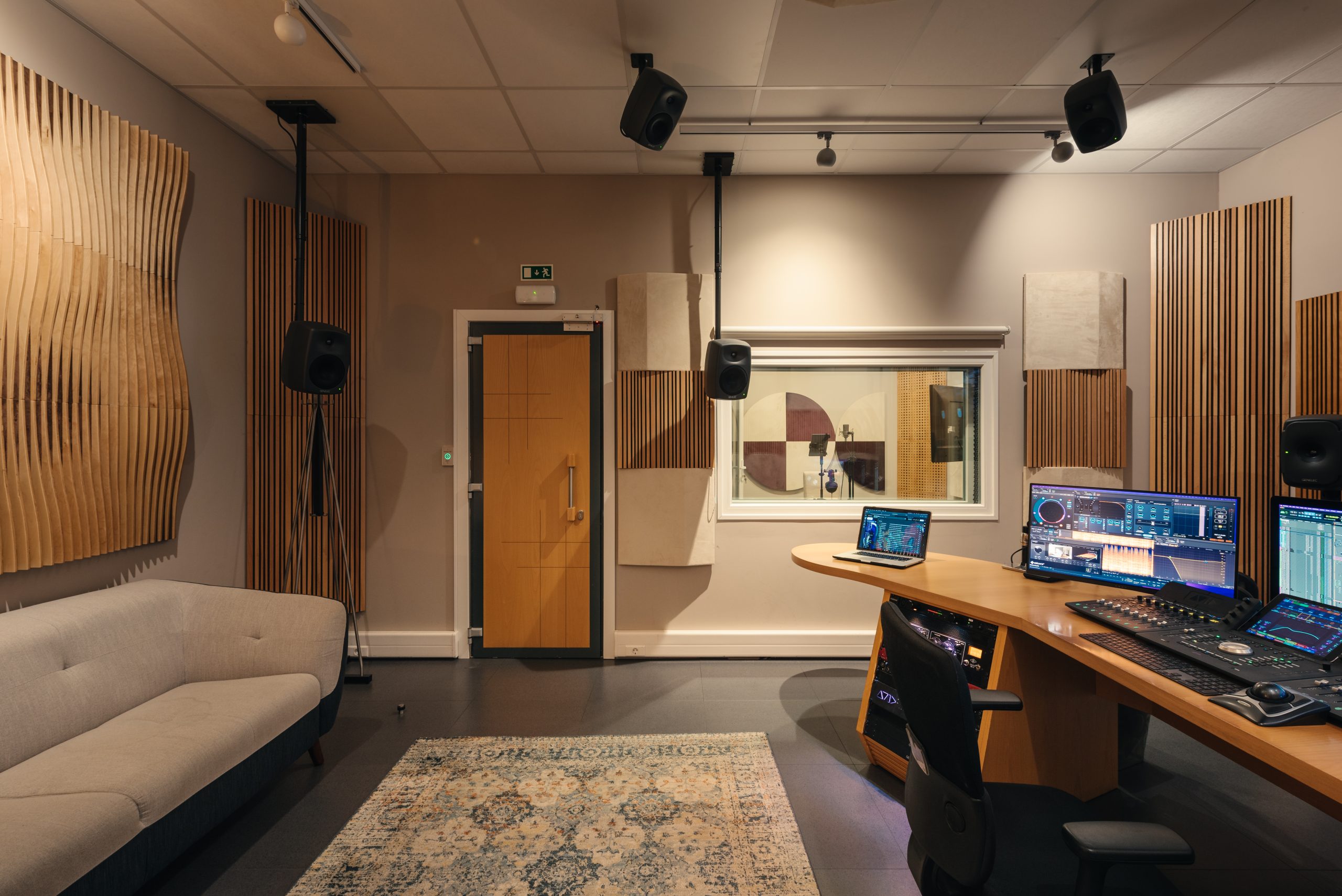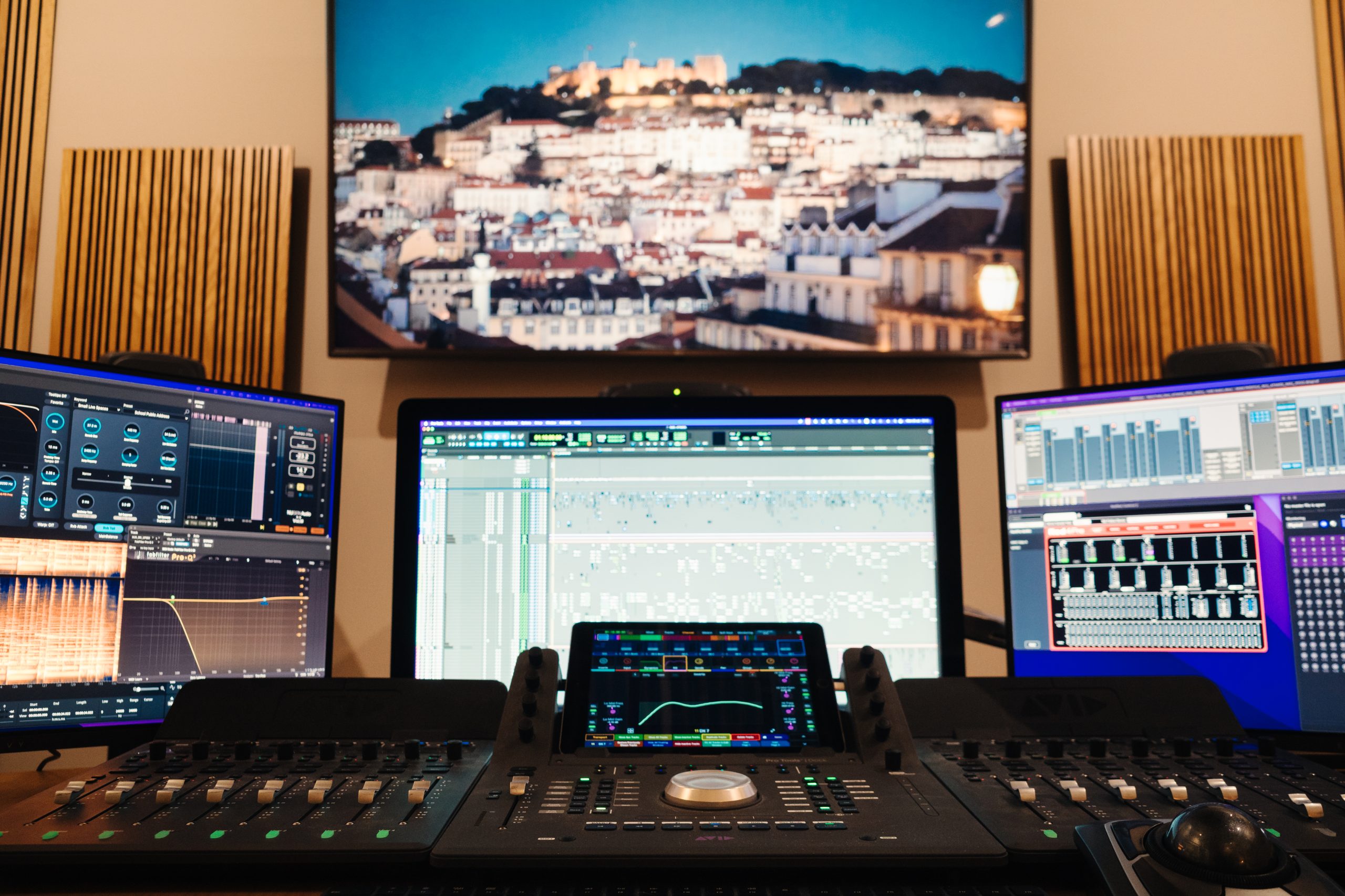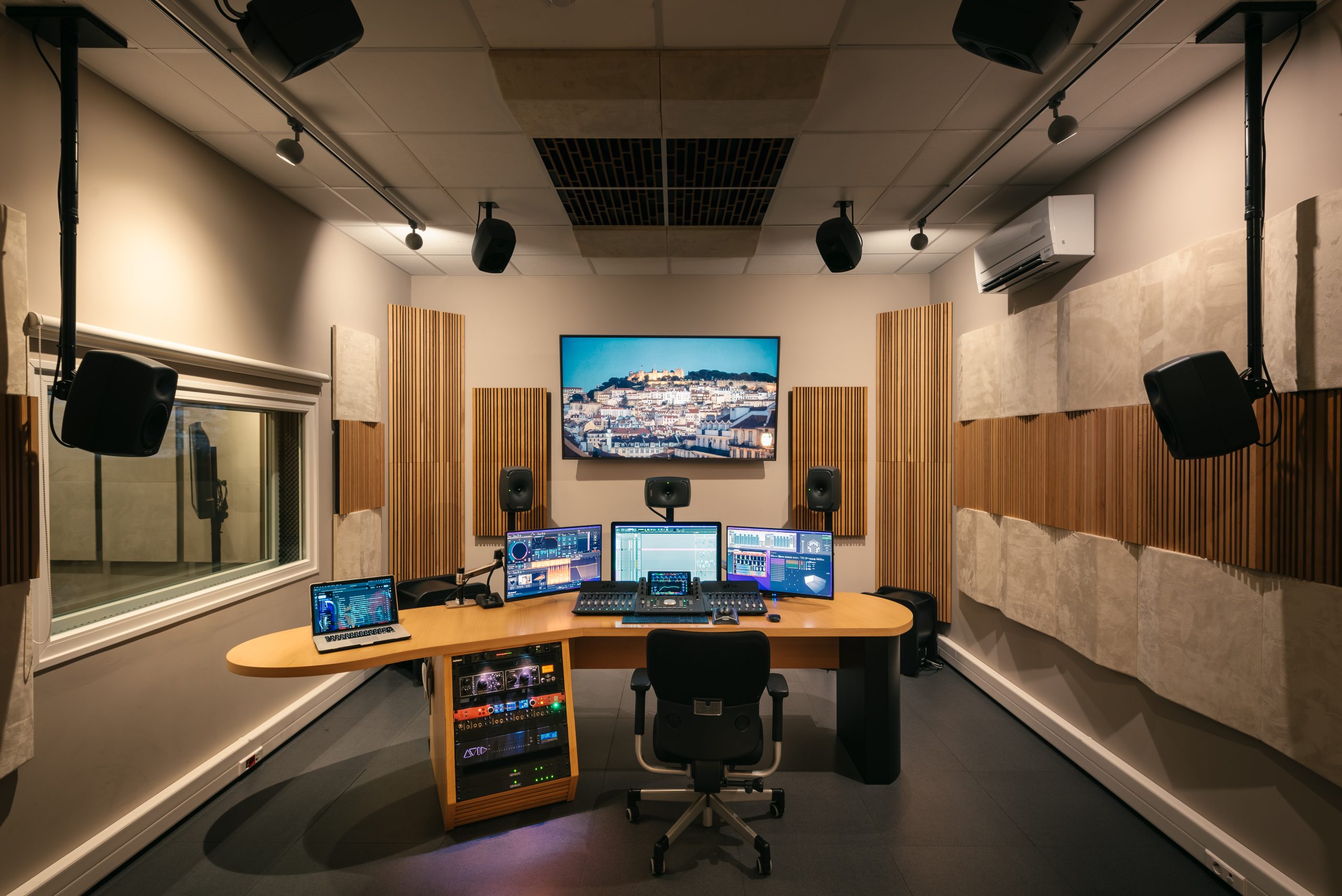 Construído em colaboração com a nossa parceira Audio Lisbon, o Estúdio A, com dimensões de 5,70×4,20×3,00 metros (CxLxA), está equipado com um sistema de monitores áudio Genelec SAM e foi calibrado pela Dolby para mistura de música e Home Entertainment, em configuração Dolby Atmos 7.1.4.